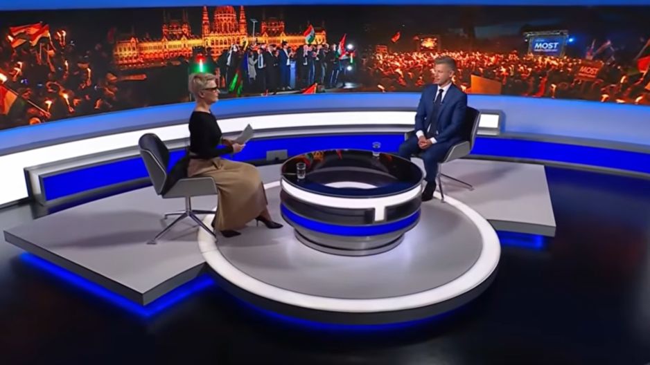 Prowadząca rozpoczęła rozmowę od pogratulowania Magyarowi zwycięstwa. Przewodniczący Tiszy stwierdził, że "dobrze jest pojawić się tu" po tak długiej przerwie. Następnie powtórzył, że zawiesi nadawanie wiadomości w mediach publicznych, które określił "fabryką kłamstw".