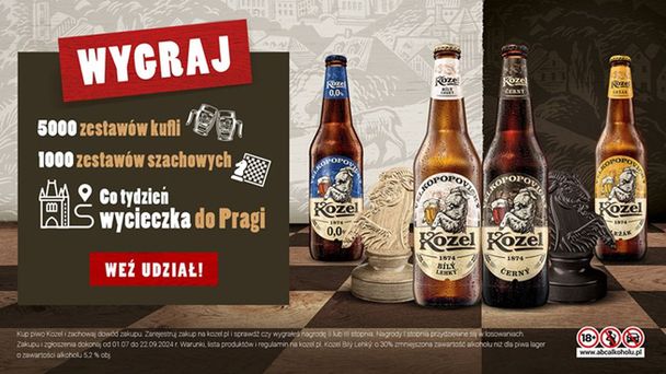 Do wygrania jest jedna z 12 wycieczek do czeskiej Pragi oraz jeden z tysiąca unikalnych, drewnianych zestawów szachów Kozel, w których wykorzystano nawiązanie do kontrastu ciemnego i jasnego piwa, a figurę skoczka zastąpiono postacią kozła Oldy – ikony marki występującej na opakowaniach wszystkich produktów. Dodatkowo konsumenci mogą wygrać też jeden z 5 tysięcy podwójnych zestawów oryginalnych kufli Kozel z rączką w kształcie koziego rogu.