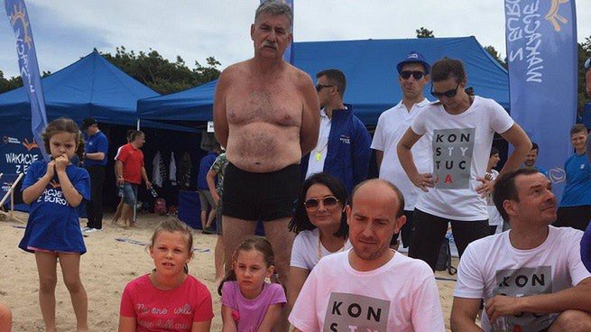 Na spotkaniu politycy PO, m.in. znani posłowie, byli ubrani w krótkie spodenki i koszulki z hasłem „Konstytucja”, znanym z transparentów pokazywanych podczas niedawnych manifestacji przeciw reformie sądownictwa.