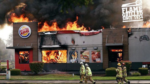 Na każdym ze zdjęć przedstawiono jedną z restauracji Burger King trawioną pożarem. Wokół każdego z otoczonych płomieniami i dymem budynków uwijają się strażacy walczący z szalejącym żywiołem.