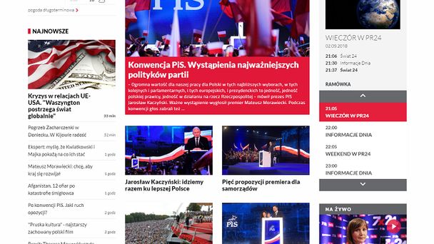 Strona główna Polskieradio24.pl ma układ kafelkowy, a newsy uszeregowane są w rzędzie po trzy lub cztery. Witryna jest w pełni responsywna. Dominuje na niej kolor czerwony, co oczywiście nawiązuje do logotypu rozgłośni Polskie Radio 24.