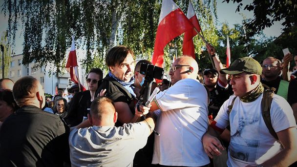- Kilka godzin wcześniej to samo robiłem na marszu antyfaszystowskim. Pod pomnikiem Powstania Warszawskiego, gdzie miał zakończyć się organizowany przez nacjonalistów pochód, zauważyłem, że jednej z kontrdemonstrantek, mimo dążenia policji do rozdzielenia obu zgromadzeń, udało się przedostać za mównicę. Trzymała transparent, żywiołowo dyskutowała z organizatorami – chciałem to nagrywać i porozmawiać z obiema stronami. Gdy wchodziłem na schody prowadzące pod pomnik, drogę zagrodziło mi dwóch mężczyzn, z czego jeden w odblaskowej kamizelce - relacjonuje portalowi Wirtualnemedia.pl Maciej Piasecki.