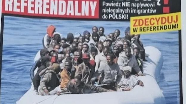 Zdjęcie przedstawia ponton z czarnoskórymi uchodźcami, czemu towarzyszy napis: „To już inwazja. Oni tutaj płyną! Powiedz NIE napływowi nielegalnych imigrantów do POLSKI!”. Podobnie odniesiono się do pozostałych trzech pytań referendalnych. „Ujawniamy tajne plany Tuska!”, „Prywatyzacja była procesem okradania Polaków!”, „Miałam pracować do śmierci!”.
