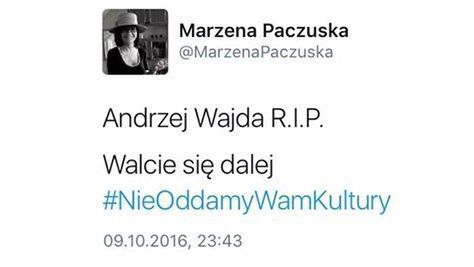 Marzena Paczuska w niedzielę wieczorem, niedługo po pojawieniu się informacji o śmierci Andrzeja Wajdy, napisała na Twitterze: „Andrzej Wajda R.I.P. Walcie się dalej #NieOddamyWamKultury”. Nawiązała do hasła „#NieOddamyWamKultury” towarzyszącego weekendowemu Kongresowi Kultury. Wpis Paczuskiej został skrytykowany przez wielu ludzi mediów obecnych na Twitterze.