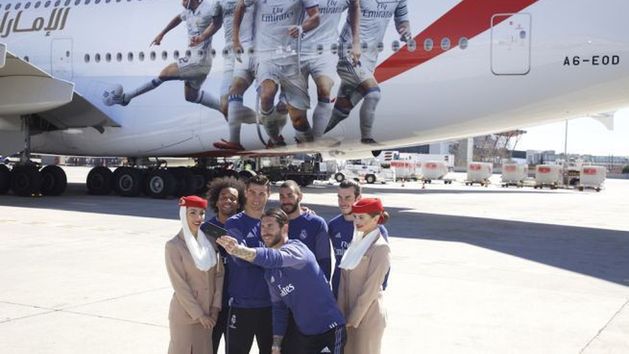 Samolot Airbus A380 linii Emirates został ozdobiony podobiznami piłkarzy Realu Madryt po swoim pierwszym lądowaniu na lotnisku Madryt-Barajas. Na kalkomanii znaleźli się: Cristiano Ronaldo, Gareth Bale, Sergio Ramos, Karim Benzema i Marcelo. Widoczna z obu stron samolotu kalkomania zajmuje ponad 500 m2 powierzchni.