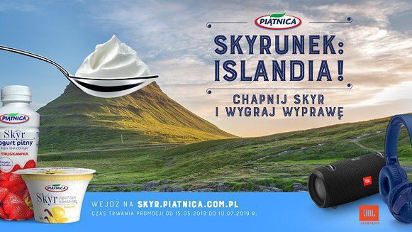 Nowa loteria promuje jogurty Skyr w butelkach. Aby wziąć udział w zabawie, należy kupić promocyjne opakowanie tego produktu, i zarejestrować się na stronie internetowej. Nagrody główne to trzy wyjazdy na Islandię, dodatkowo do zdobycia głośnik i 10 słuchawek JBL. Losowanie nagród głównych 11 lipca.