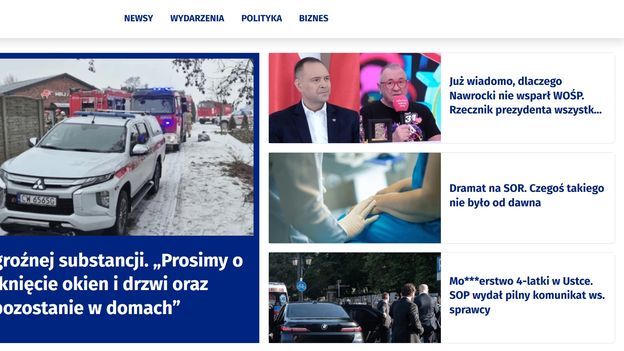 Na stronie głównej serwisu są cztery główne działy: newsy, wydarzenia, polityka i biznes. Treści to miks polityki, newsów kryminalnych czy tematów konsumenckich.