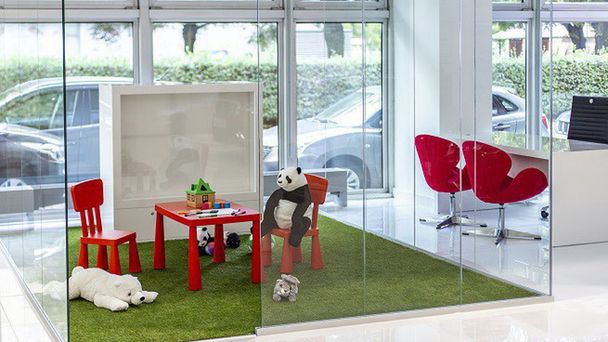 Dla dzieci zaprojektowano przytulną i bezpieczną strefę zabaw, oświetlaną niebieskim światłem.
