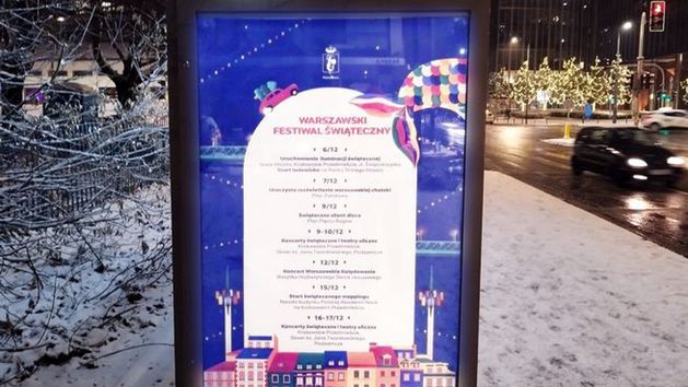 Warszawski Festiwal Świąteczny wprowadził na stołeczne ulice niezrównany nastrój. Program wydarzeń oraz życzenia świąteczne dla mieszkańców znalazły się na słupach tradycyjnych TRAFFIC, słupach WARS i SAWA, spektakularnej przestrzeni LED space na skrzyżowaniu linii Metra Warszawskiego, a przede wszystkim na wiatach przystankowych.