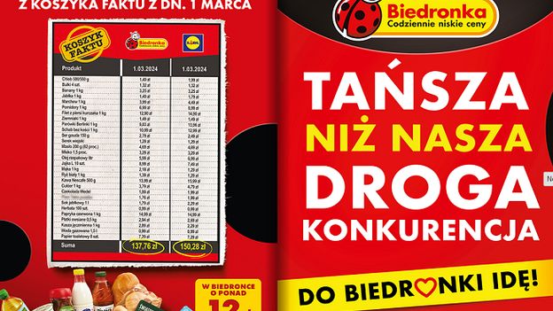 Pojawiła się natomiast reklama z logo Biedronki u góry strony, pośrodku widnieje hasło “Tańsza niż nasza droga konkurencja”, a na dole mniejszą czcionką “Do Biedronki idę”. Obok znajduje się tabela porównawcza cen w Biedronce i Lidlu. Zamieszczono przy niej informację, że Biedronka sprawdziła ceny 29 podstawowych produktów z koszyka “Faktu” z 1 marca br. W tabeli w jednej kolumnie jest logo Biedronki, w drugiej - logo Lidla. U dołu strony znajduje się w żółtej ramce informacja, że w Biedronce jest ponad 12 zł taniej niż w Lidlu.