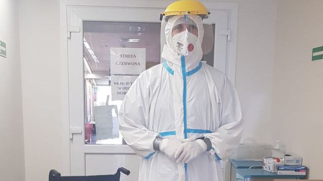 - Trzeba się rozebrać niemal do rosołu. Nie ma sensu zostawać w spodniach czy koszuli, bo kombinezon jest nieprzepuszczalny, a człowiek się poci. Po czterech godzinach jest tak mokry, jakby wyszedł z wanny. Ubieram się w odpowiedniej kolejności. Kombinezon, kaptur na głowę, jedne rękawiczki, potem drugie tak, żeby rękaw wszedł do środka. Jak nie ma długich, to te krótkie zaklejam taśmą. Dalej maseczka z filtrem na twarz, na głowę przyłbica. Jeszcze dokładnie obwiązane buty i można wchodzić na oddział. To mi zajmuje 20 minut. Zdejmowanie trwa jeszcze dłużej - opowiada nam Tomasz Rożek, dziennikarz naukowy "Gościa Niedzielnego" i radia 357.