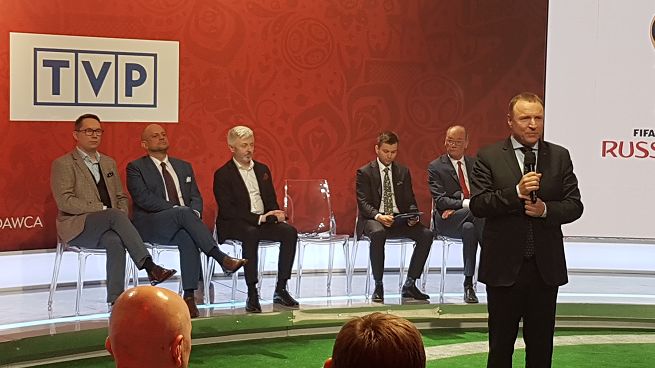 Telewizja Polska wyśle do Rosji swoją ekipę. Znajdą się w niej Dariusz Szpakowski, Jacek Laskowski, Maciej Iwański i Tomasz Jasina. Spotkania będą także komentować: Jacek Jońca, Sławomir Kwiatkowski, Hubert Bugaj, Szymon Borczuch i Aleksander Roj. Towarzyszyć im będą eksperci najwyższej klasy: Radosław Gilewicz (były reprezentant Polski, od kilkunastu lat ekspert telewizyjny), Andrzej Juskowiak (król strzelców igrzysk w Barcelonie, wielokrotny reprezentant Polski), Maciej Żurawski (król strzelców Ekstraklasy, uczestnik Mundialu 2002 i 2006), Kamil Kosowski (wielokrotny reprezentant Polski), Marcin Żewłakow (były reprezentant Polski, od sześciu lat związany z TVP jako jej stały ekspert), Mirosław Trzeciak (były reprezentant Polski) i Robert Podoliński (trener). Reporterzy TVP Sport będą towarzyszyć reprezentacji Polski 24 godziny na dobę.
