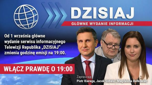 Do ostatniego dnia sierpnia półgodzinny magazyn „Dzisiaj”, zawierający podsumowanie najważniejszych politycznych i społecznych tematów, emitowany był o godz. 18:30. Teraz jednak TV Republika przesuwa go na godz. 19:00, a Tomasz Sakiewicz – prezes i redaktor naczelny – nie ukrywa, że ten ruch ma “uderzać” w nadawane w tej godzinie „Fakty” TVN. - Chcemy dać wreszcie Polakom szansę zobaczenia o godzinie 19 prawdy – podsumowuje Sakiewicz. Zmiana promowana jest hasłem: "Włącz prawdę o 19:00".