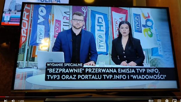 Po godz. 11, zaraz po tym jak Ministerstwo Kultury i Dziedzictwa Narodowego poinformowało powołaniu nowych władz Telewizji Polskiej, Polskiego Radia i PAP, emisję TVP Info, TVP3 i TVP World przerwano we wszystkich formach dystrybucji: naziemnej telewizji, sieciach kablowych, platformach cyfrowych oraz w aplikacjach i serwisach internetowych TVP.