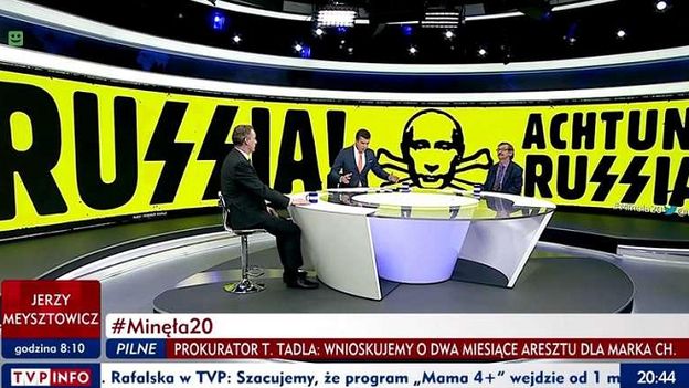 - Uznałem, iż autorzy programu eksponując plakat jako dominantę obrazu w studiu przez cały czas trwania „Minęła 20” - wykazali się brakiem wyobraźni i empatii historycznej. Prezentowanie przez blisko godzinę trwania programu grafiki Wojciecha Korkucia mogło prowadzić mniej wyrobionych widzów do przekonania, iż Rosjanie utożsamiają się z ideologią faszystowską - ocenił Jacek Kurski. - Jak bardzo byśmy nie byli krytyczni a nawet wrodzy imperialnej polityce Putina to jednak takie uproszczenie wobec narodu, który w wojnie z hitlerowskimi Niemcami w II wojnie światowej stracił 25 mln istnień własnych obywateli może ranić poczucie bólu po tej utracie, urągać pamięci historycznej i jest nie do przyjęcia - dodał.
