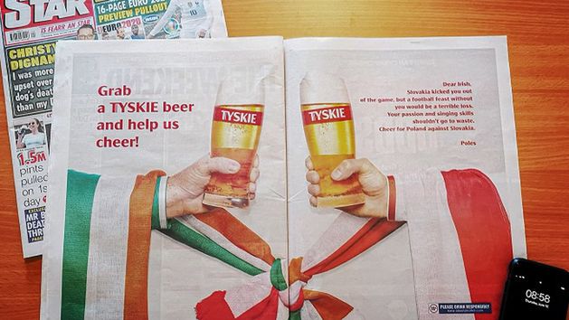 "Drodzy Irlandczycy, Słowacja wyeliminowała was z turnieju, ale nie wyobrażamy sobie rozgrywek bez was. Wasza pasja i śpiew nie mogą się zmarnować. Dopingujcie Polskę w meczu ze Słowacją. Polacy "– reklamą z tym apelem opublikowaną w największym Irlandzkim dzienniku, marka Tyskie zachęca irlandzkich kibiców do kibicowania reprezentacji Polski w meczu ze Słowacją, który odbędzie się 14 czerwca w Sankt-Petersburgu.
