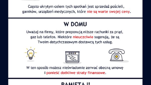 Wspólna akcja Urzędu Ochrony Konkurencji i Konsumentów, Komendy Głównej Policji, Zakładu Ubezpieczeń Społecznych oraz Kasy Rolniczego Ubezpieczenia Społecznego ma ostrzegać seniorów przed nieuczciwymi praktykami, a także przypominać o przysługujących im prawach, w tym możliwości rezygnacji – w ciągu 14 dni – z umowy podpisanej we własnym domu lub na pokazie.
