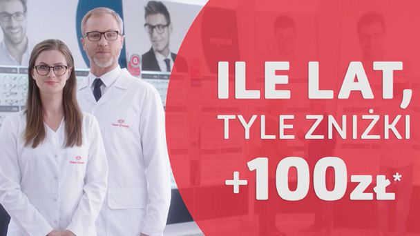 W ramach promocji przy zakupie okularów korekcyjnych klient otrzymuje zniżkę wynoszącą tyle złotych, ile ma lat, plus 100 zł. Natomiast przy zakupie okularów progresywnych zniżka jest podwójna.