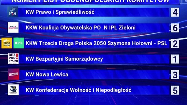 Infografika z numerami list wyborczych, wylosowanych przez Państwową Komisję Wyborczą dla sześciu komitetów, które zarejestrowały kandydatów we wszystkich okręgach, pojawiły się w piątkowych „Wiadomościach” w materiale Bartłomieja Graczaka.