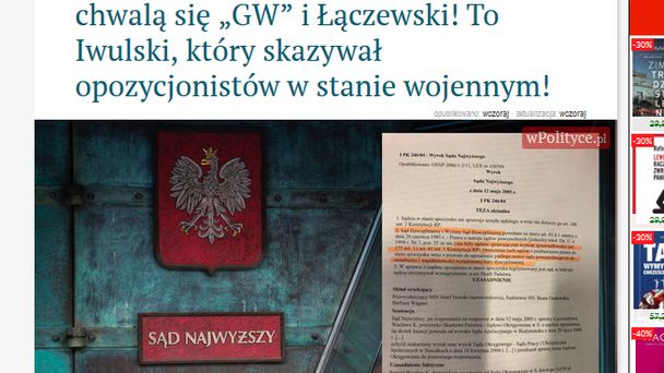 Natomiast w środę Czuchnowski wysłał maila z pytaniami wiceministrowi sprawiedliwości Marcinowi Warchołowi, dołączając zdjęcie wyroku z własnymi zakreśleniami. W czwartek ta fotografia (tak samo wyglądająca, z identycznymi zakreśleniami) znalazła się w artykule Wojciecha Biedronia na wPolityce.pl polemizującym z tekstem „Gazety Wyborczej”. - Wiemy, kto wydał wyrok, którym chwalą się ‘GW’ i Łączewski! To Iwulski, który skazywał opozycjonistów w stanie wojennym! - czytamy w tekście Biedronia.