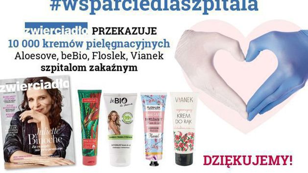 Wydawca miesięcznika „Zwierciadło” przekazało kremy do rąk pozyskane od firm Sylveco, Floslek, beBio na potrzeby personelu medycznego. - Wiemy, że zachowując najwyższe standardy medyczne cały personel musi często odkażać dłonie środkami dezynfekcyjnymi a kremy te mogą złagodzić dolegliwości z tym związane tj. mocne wysuszenie, zaczerwienienia i ranienie skóry. Życzymy wszystkim pacjentom szybkiego powrotu do zdrowia, czytelniczkom i całemu personelu medycznemu wytrwałości i sił w niełatwej walce z epidemią - mówi Adam Popielski.