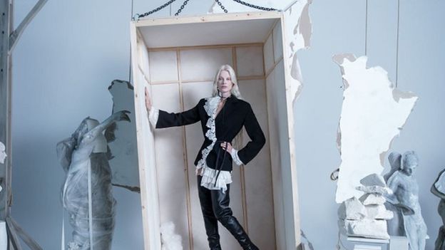 Na zdjęciach modelka pozuje przed manekinami z brakującymi kończynami i posągami owiniętymi białą tkaniną, która przypomina plastik. Wokół niego znajdują się również zniszczone elementy wyposażenia wnętrz.