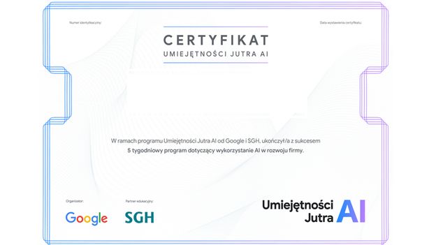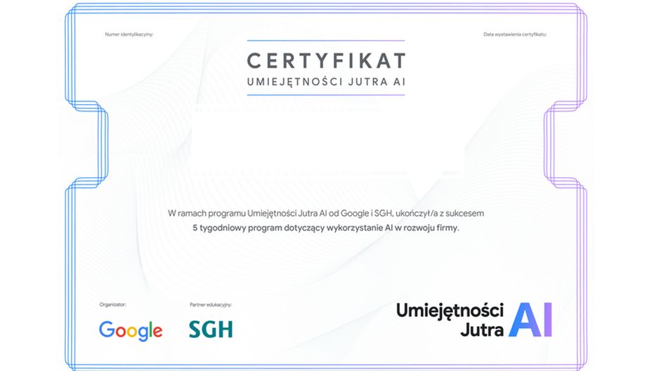 "Umiejętności Jutra: AI" to bezpłatny program szkoleniowy Google, realizowany we współpracy z SGH Szkołą Główną Handlową w Warszawie, która jest współodpowiedzialna za część merytoryczną kursu. Kurs kierowany jest do właścicieli i pracowników małych oraz średnich przedsiębiorstw, studentów oraz ekspertów, którzy chcą rozwinąć swoją wiedzę na temat sztucznej inteligencji.