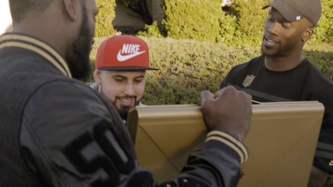 Sportowcy odnaleźli kilku wybranych kibiców i jednocześnie użytkowników prowadzonego przez Nike serwisu Nike+ pomagającemu w prowadzeniu sportowego trybu życia. Zaskoczonym mężczyznom gwiazdy NFL wręczyły oryginalne prezenty - specjalne egzemplarze piłkarskich butów Vapor Untouchable 2 oraz tenisówek z limitowanej serii Air Force 1 Precious Metal. Każda para obuwia była oznaczona autografem wręczającego ją sportowca, a całość została zapakowana do efektownej złotej walizki.