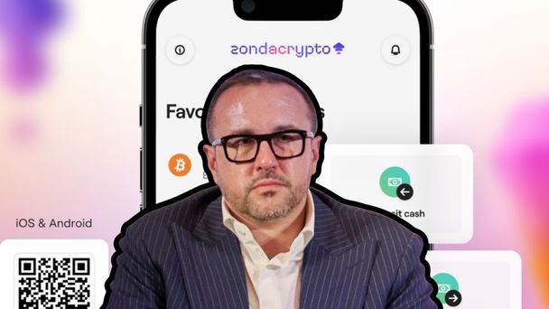 Przemysław Kral na tle aplikacji mobilnej Zondacrypto
