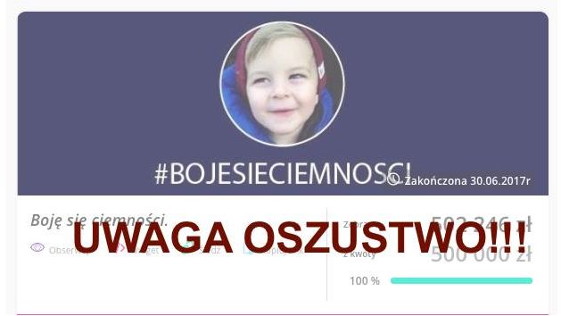 Trwająca od lutego br. akcja „Boję się ciemności” na rzecz Antosia Rudzkiego, w którą zaangażowało się wiele osób znanych publicznie, jest oparta na oszustwie. Organizatorem zbiórki był 23-letni mężczyzna. Przedstawiciele platformy Zrzutka.pl złożyli zawiadomienie do prokuratury o możliwości popełnienia przestępstwa w poniedziałek oraz podjęli współpracę z organami ścigania.